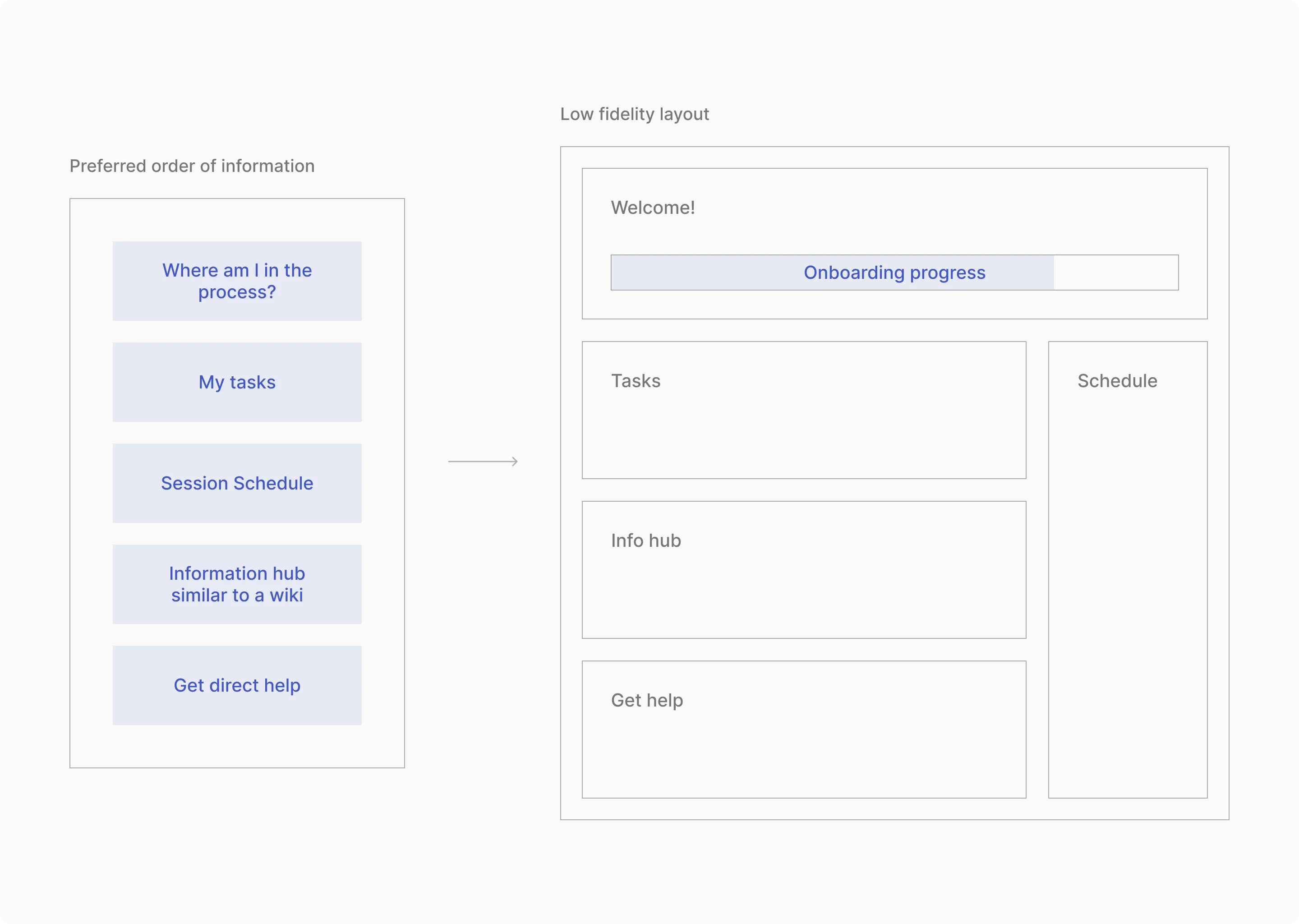 We narrowed down to five main pieces of information that needed to be shown during onboarding, as shown below. Recruits also stressed that clear indications of progress were very important as they wish to be kept aware of exactly where they are in the onboarding process.
