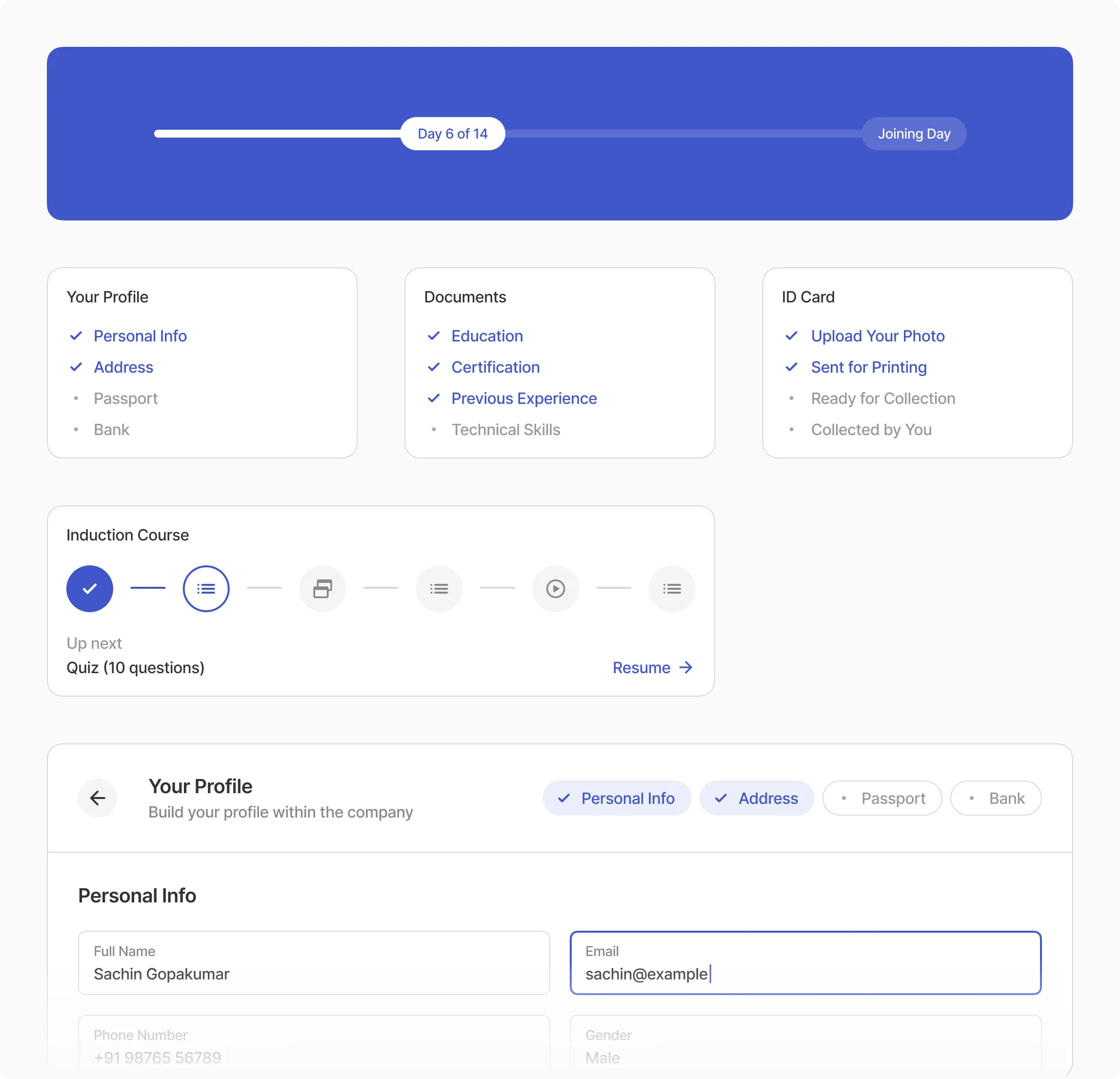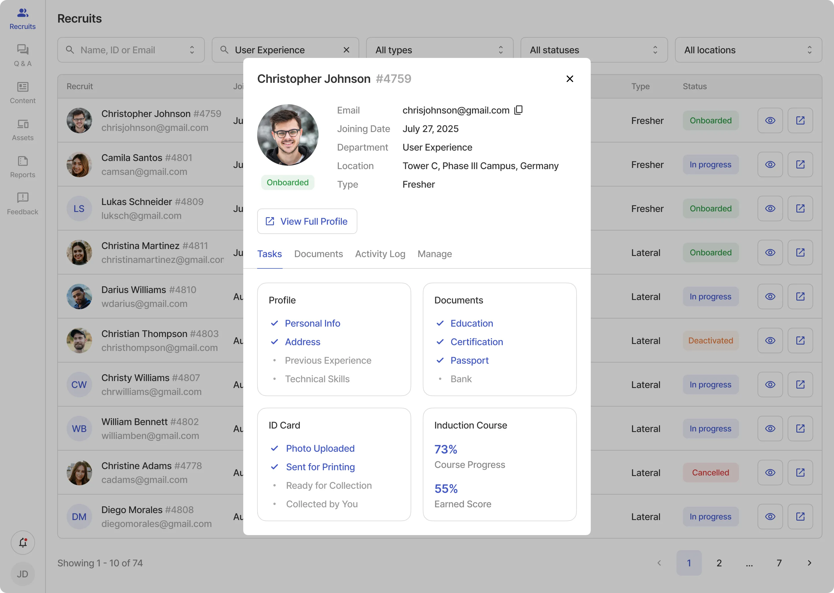 The new recruits are onboarded by completing various tasks such as updating their profile, uploading documents, and more. The recruitment staff (HR, IT and L&D departments) makes sure that recruits complete their tasks properly and on time.